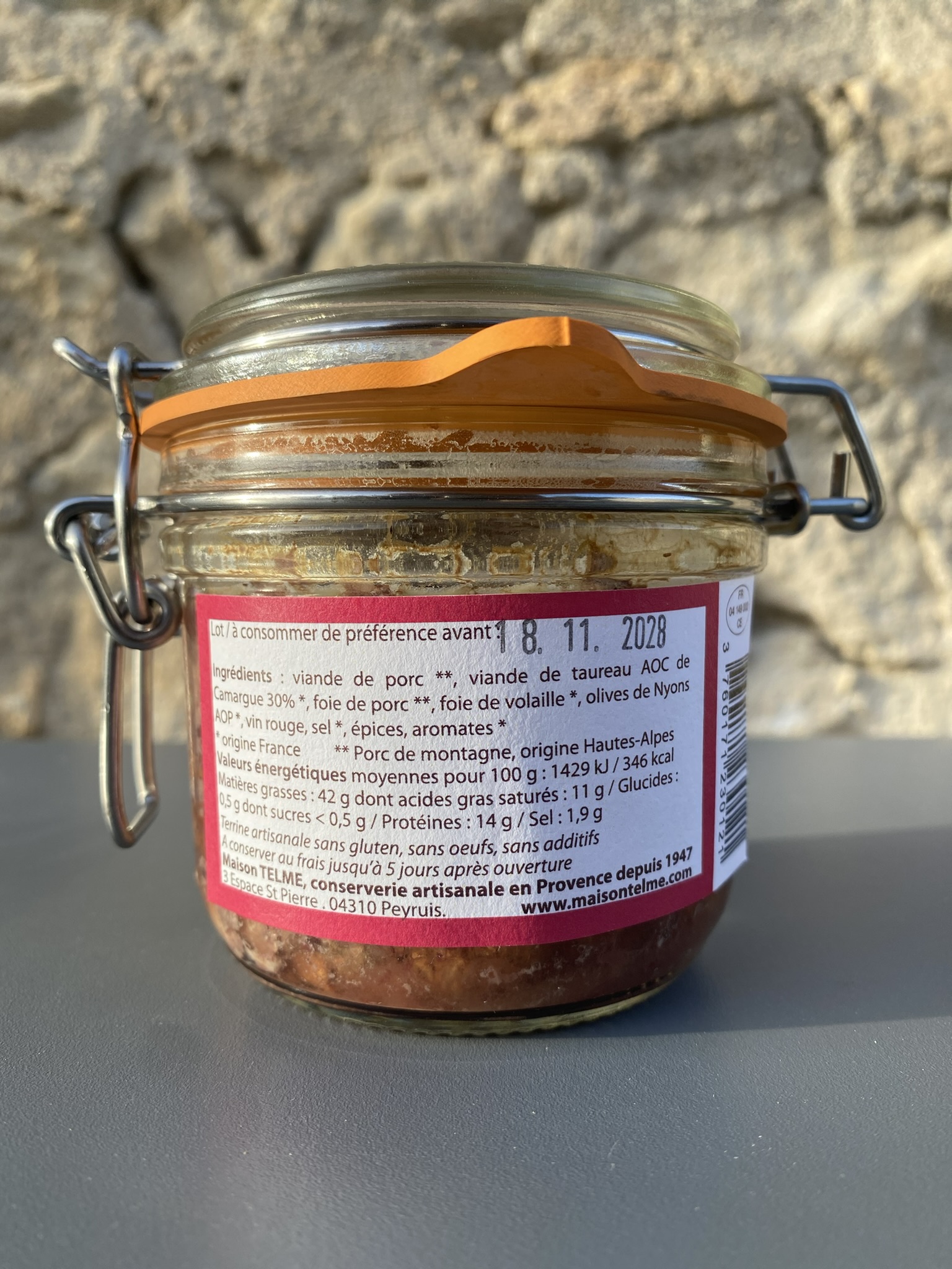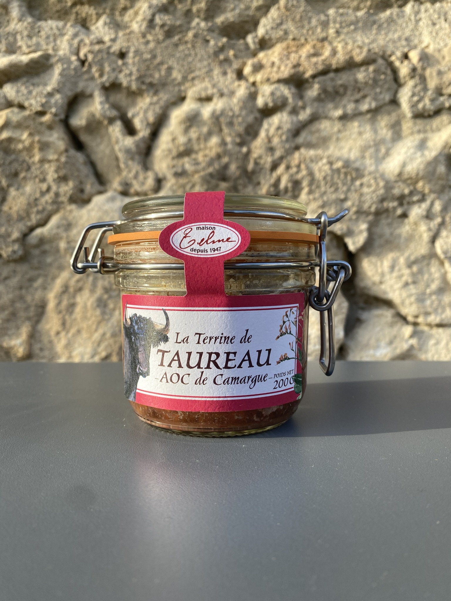 Savourez toute l’âme de la Camargue dans cette terrine de taureau d’exception. Elaborée à partir de viande de gardianne AOP, elle révèle un caractère affirmé, subtilement adouci par une base de porc de plein air. La viande est délicatement marinée au vin rouge qui lui confère des notes profondes et chaleureuses, tandis qu’un trait de piment d’Espelette AOP vient réveiller l’ensemble. Authentique produit du terroir, cette terrine marie puissance et finesse: des saveurs franches, un équilibre maîtrisé, et ce parfum de Sud qui évoque les traditions de gardians.